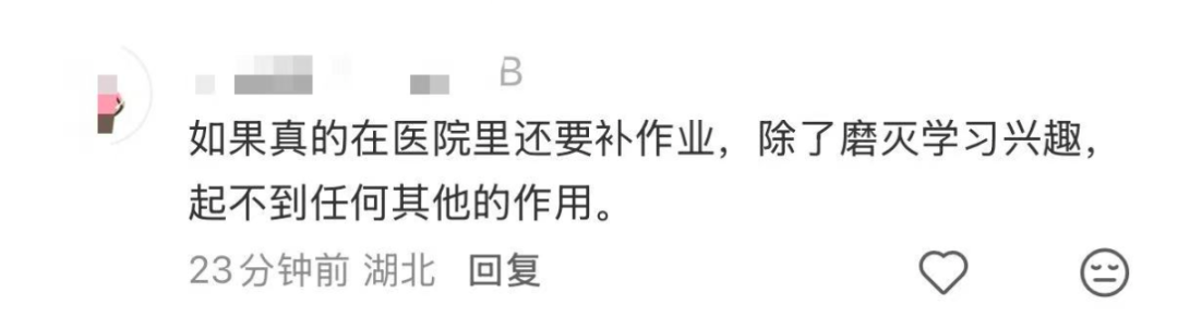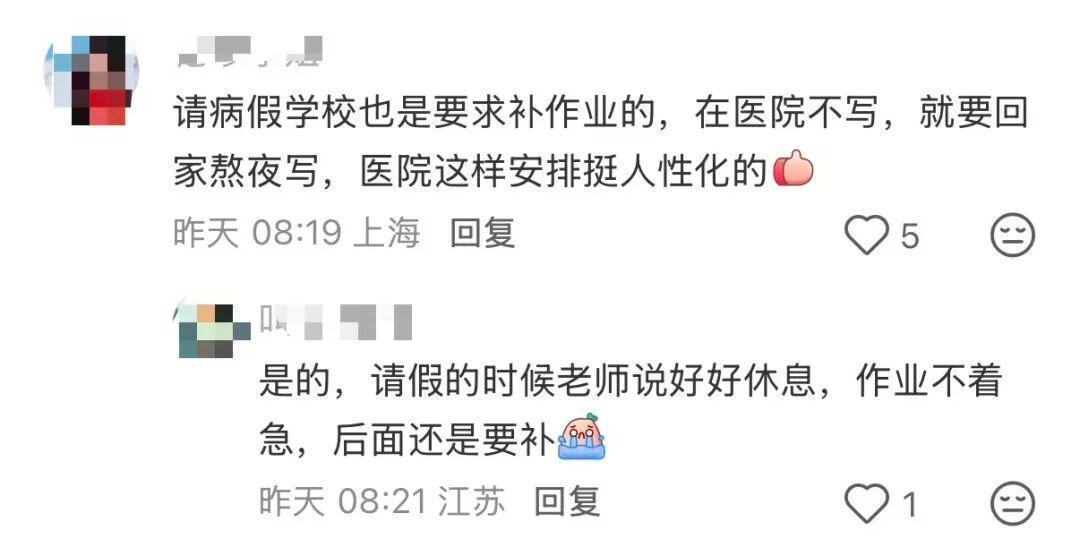 有网友表示这是挺便民的设计孩子确实有写作业的需要就算请病假后续也要补作业还不如在医院写一点
